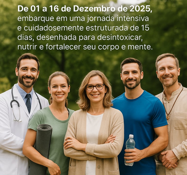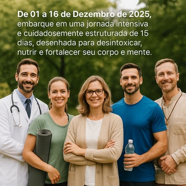De 01 a 16 de Dezembro de 2025, embarque em uma jornada intensiva e cuidadosamente estruturada de 15 dias, desenhada para desintoxicar, nutrir e fortalecer seu corpo e mente. Este não é mais um programa genérico; é uma revolução na sua saúde, ancorada em uma abordagem integrativa, funcional e de estilo de vida.